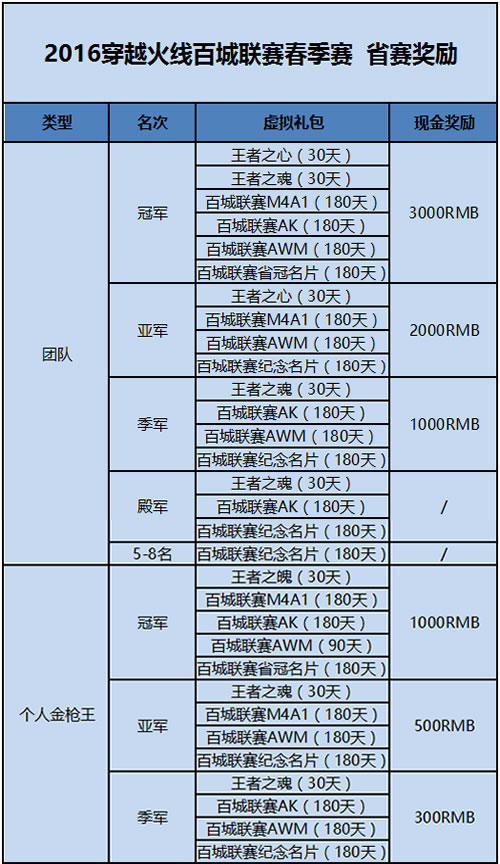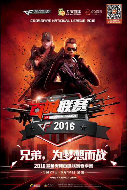 2016年百城联赛春季赛是穿越火线运营团队为所有玩家打造的全国性海选赛事,覆盖全国29个省份600个城市,打造家门口的比赛,赛事带到用户身边。本届比赛分为周赛,城市赛,省赛,总决赛,比赛通过“团队竞技模式”“爆破模式”决出优胜者。