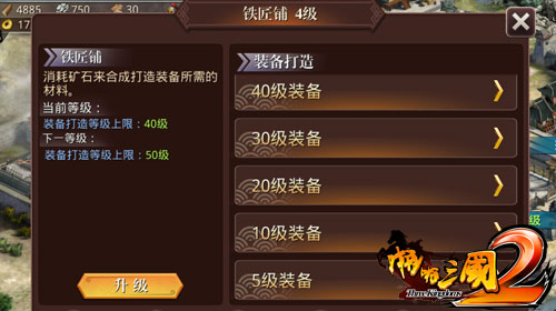玩家可以通过消耗矿石,在铁匠铺里打造相应等级所需的装备。铁匠铺等级越高,能制作的装备等级就越高。比如,刚开始只能生产5级的装备,升级一次铁匠铺后就可以生产10级的装备。