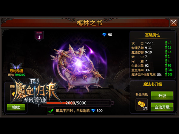 传说中,梅林之书中记录了许多神秘而强大的上古魔法,曾随着大魔法师一起消失多年,如今又再度现世。掌握了梅林之书就像是掌握了一个巨大的魔力宝库,你可以从这本书中得到前所未有的强大力量。在新版本“梅林之书”系统里,朋友们可以通过升级梅林之书获得战斗力的提升,更能够在擦拭这本书的时候,随机显示出几段神秘的魔法秘语,提升对应的附加属性,帮助你提升自己的力量。