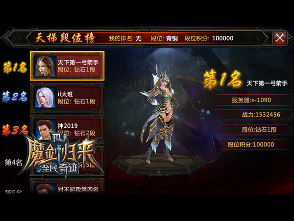 跨服天梯赛,本次新版本的重头戏之一,玩家们能够通过该系统匹配挑战来自所有服务器的小伙伴,与竞技场不同,这里我们不再是与电脑控制的角色战斗,而是双方同时在线的自由作战。为了表彰强者,天梯赛系统中划分为青铜、白银、黄金、白金、钻石五个段位,玩家们每日前五场挑战会根据所在段位和胜负获取不定量的荣耀点数,进而在荣耀商店中购买擦拭和升级梅林之书所用的物品,不断强大自身。值得一提的是,每月末,系统会根据跨服天梯赛的段位排名,来对朋友们进行一次嘉奖,奖品丰厚。