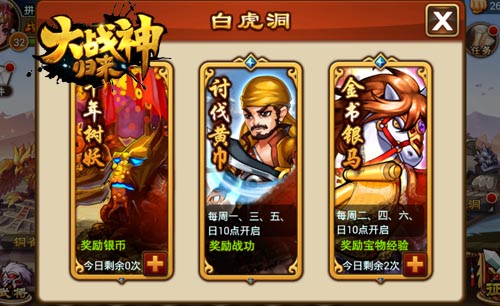 “白虎洞”同样是玩家不可错过的一大玩点,最重要的是这里不会消耗体力。“白虎洞”包含三种玩法:“千年树妖”根据玩家对摇钱树的伤害来获得相应的银币奖励;“讨伐黄巾”每周一、三、五、日10点开启,可以获得战功;“金书银马”每周二、四、六、日10点开启,可获得宝物经验。这里主要产出强化装备、武将、宝物等资源。