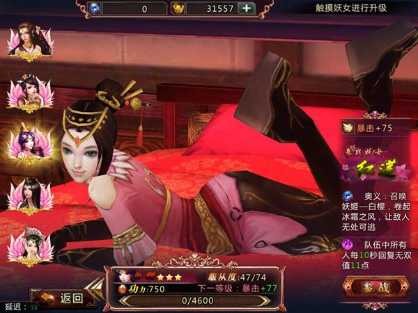 更有美艳妖姬助战,大大提升了玩家的动力!美女相陪,战斗不累,细心调教,让横行江湖的妖姬为你所用,古装汉服剧情对白,为你营造充满儿女情长的风雨江湖。