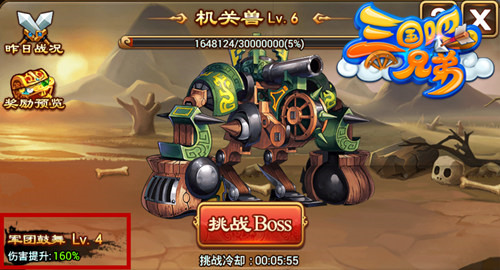 《三国吧兄弟》为热爱团队作战的玩家量身打造了团战副本:大战机关兽。机关兽拥有高达8位数的HP和6位数的伤害,好在一个军团内的玩家们可以结伴挑战它。机关兽每被消灭一次,就会在一定时间之后重装复活,并且自动升级为更高级别的机关兽。所以机关兽级别,往往被认为是一个军团战斗力的最真实体现。