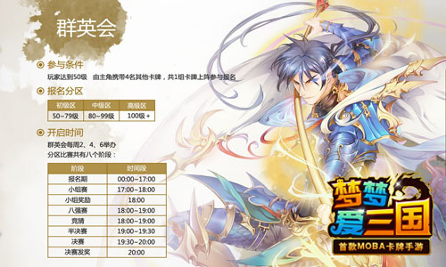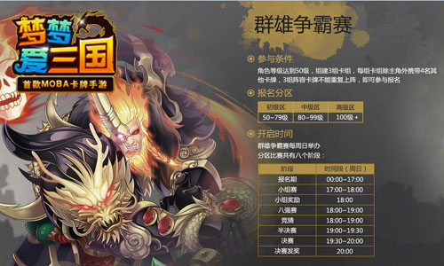 群雄争霸赛仅在每周的周日开启一次,分为初级区、中级区、高级区三个等级分区,玩家达到50级即可报名参与,报名需要配置三组阵容,阵容中卡牌不能重复配置,阵容无替补缘分加成,无国家限制,报名期间可以调整阵容。