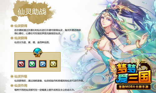 目前仙灵拥有四种品质,最低品质为蓝色,最高品质为金色,获得仙灵之后可以进行培养升级。仙灵有各种不同的种类,每一种仙灵可以增加不同类型的属性,在仙灵系统中配置仙灵就可以获得属性加成啦,有了“她们”可爱的帮助,主人就可以在战场中长笑当歌,虐爆对手。