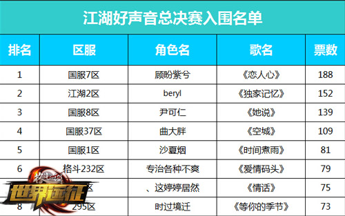 江湖好声音活动一经推出,就受到了众多玩家的热情参与!玩家们积极踊跃投稿让整个好声音微群都炸开了锅!随着四期的海选投票,最终全民票选抉择出8名实力唱将,而这8名唱将将会演绎全新的曲目,让全民玩家来一场耳朵的盛宴!江湖好声音的总冠军,也会由各位玩家投票选出哦!