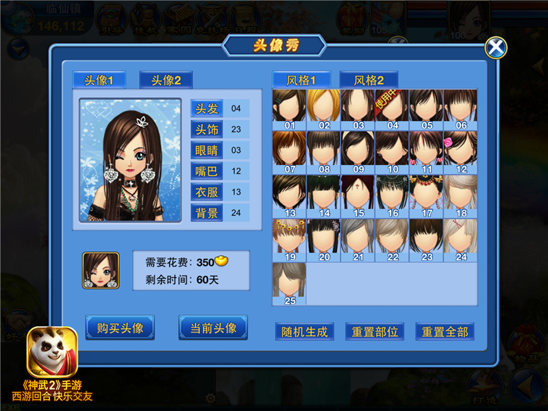 头像秀的风格多样,大家可以随心去搭配专属的头像。头像总共有两种风格,25种选择的清新风格和20种搭配的萌系风格,无论你有多么挑剔的眼光,总有一款适合你。大家可以选择头发、头饰、眼睛、嘴巴、衣服、背景6个部位。随心的DIY,在《神武2》手游,人人都是时装设计师。
