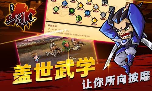 《古川三国志》跟其他三国游戏不同,战斗过程不再是毫无技术含量的全自动。游戏中拖动武将可以进行走位、攻击或治疗,选中武将可以释放华丽的技能。让玩家在战斗中亲自操作武将,感受战斗的快感。也让玩家更好的感受微操作游戏带来的无与伦比的乐趣。《古川三国志》完美地融合了动作和即时策略的游戏玩法,同时玩家还可以组建武将小队,让战斗变得更加畅爽。不仅如此,《古川三国志》再现三国精锐部队,飞熊军,大戟士,虎豹骑,给玩家一个最近接历史的三国时代。当然,在排兵布阵的同时,还有武学系统可以提升武将自身的战斗能力,以及绝世神兵,让你培养出最英武的盖世神将!