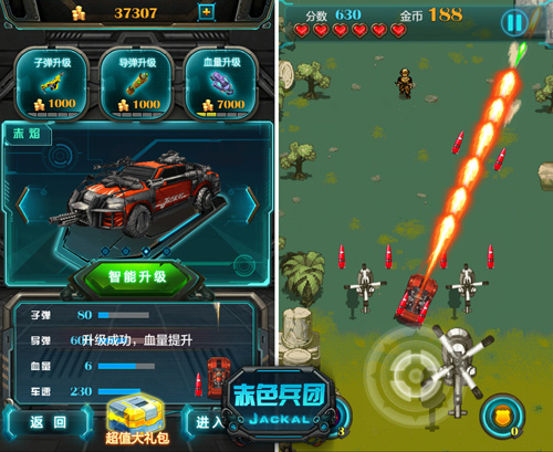 游戏内共有4辆战车,每辆战车均有3个升级部件,分别为机枪升级、炮台升级、装甲升级,其中机舱升级可以提升子弹伤害和弹道数量;炮台升级可以提升导弹伤害;装甲升级则可以提升战车的血量上限。随着关卡的推进,BOSS和小怪的血量会越来越高,伤害也会随之提升,所以玩家也需要根据实际情况适时地提升机枪、炮台和装甲等级,否则如何能够战胜强悍变态的BOSS成功营救被俘战友呢。