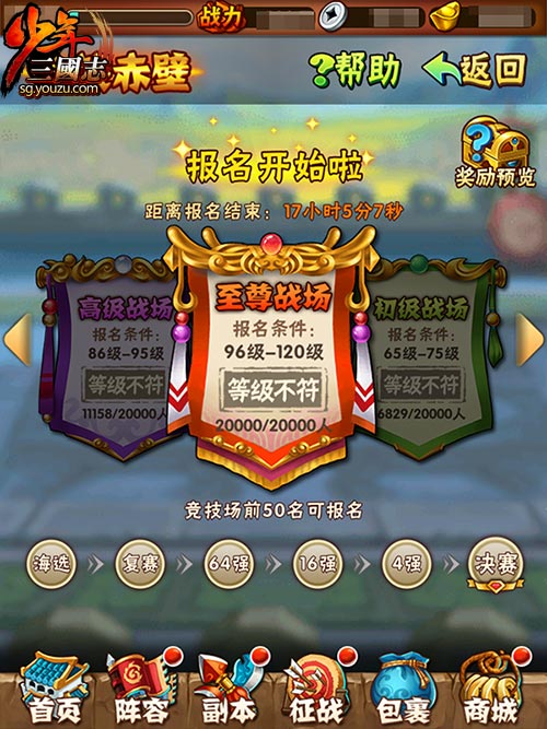《少年三国志》决战赤壁按照少年的等级划分为四个战场,参赛者需要同时满足等级要求和竞技场排名才能得到报名资格。
