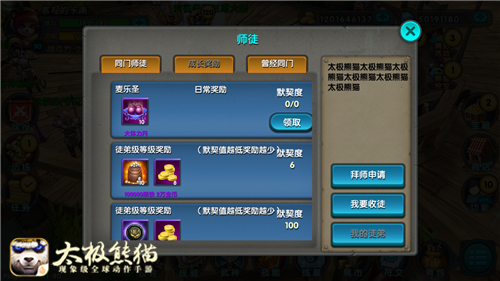熊猫师妹空降伊瓦兰斯,战局再次变得扑朔迷离。为了帮助新人快速成长,同时方便玩家交流感情,《太极熊猫》在新版本中特此开设师徒系统功能,大家可以通过【功能】-【社交】找到【师徒】页面,师徒可以每天上线随意问候,一起组队打副本,一起培养默契度,还可以交流双方在游戏中的装备武神搭配及玩法,还有更多丰富师徒奖励获得哟!