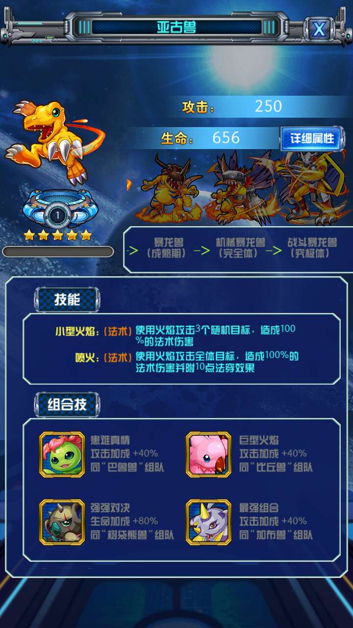 就像《数码宝贝》里的数码宝贝需要组队战斗,才能打败敌人,莫斯提兽也需要队友才能有更强的战斗力。莫斯提兽和黑小狗兽,阿卡迪兽,小妖兽,巴达兽组队,可以提高自身的生命值和攻击值。