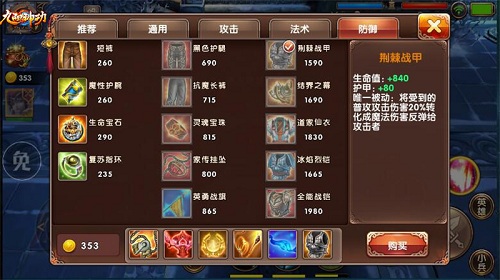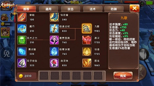 后期:九歌、渡灵、仙音、困龙、傲天、荆棘战甲(若是后期己方处于劣势,可于傲天之前先装备荆棘战甲,可根据战场实时战况,若是敌方法系输出较多较强,则可将荆棘战甲更换为结界之幕,而处于顺境之时,则可按文章所述顺序进行出装。)