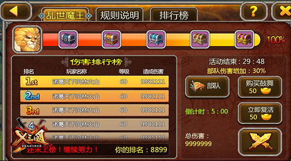 BOSS大大的实力深不可测,粗线时间飘忽不定,但是玩家等级、参与人数都会影响BOSS的发挥,只要主公们齐心协力抗击BOSS,大家都能获得不错的奖励!什么“尾刀奖”、“阳光普照奖”、“伤害排行奖”等,宝石装备元宝全部公平到手!先剧透有几个问题,主公们现在就可以开始谋划了,比如,该怎么实现伤害最大化啊,或者抢“尾刀”的技巧有哪些等等!想想就觉得超好玩的说!
