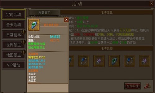当然,作为一个大型PVP副本,称霸天下绝不止是环境恶劣那么简单。在副本中各位大侠的PK模式将被强制设置为全体模式,铁血厮杀就此开始!优胜劣汰、弱肉强食,战场法则的残酷在此锋芒毕露!在称霸天下的副本中被击杀后,大侠将会被强制离开战场,退出副本,而10分钟后入口将被关闭,此后只出不入,直至副本中剩下唯一一位存活的胜利者。这位大侠将独享特有称号“天下无敌”,且将有可能获得《屠神》终极戒指——“特戒”!当然,其余参与者也绝不会白来!因为只要每在活动场景中存活3分钟,就将获得一次荣誉和奖券的奖励!