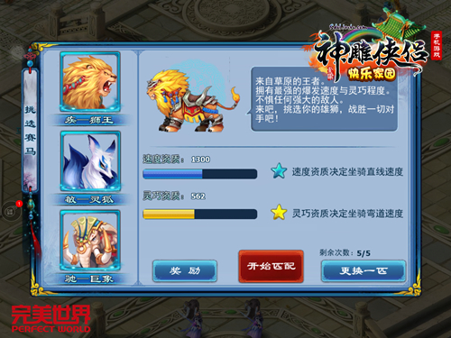 谁说赛马就一定是马?换成其他狂野猛兽更激情更野性。在《神雕侠侣》的赛马活动中,按照属性的高低不同分别有狮王、灵狐、巨象三种。每只野兽在速度和灵巧两大资质上各有偏重,是追求直线速度还是转弯漂移的灵巧,各位大侠可以根据自己的喜好和经验自由选择。战中胯下是大雕,娱乐胯下是野兽,总之作为大侠就是要喝最烈的酒、骑最野的兽,小马还是乖乖去过河吧。