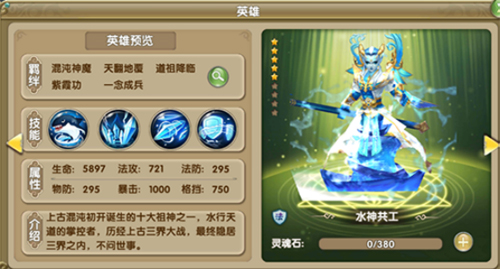 以水为脚,手持长叉,头顶双角,全身水元素环绕;翩翩君子模样的共工可不是小角,作为远程法师的他,可以召唤水怪袭击,还拥有减速风筝的能力,莽荒必备呀!