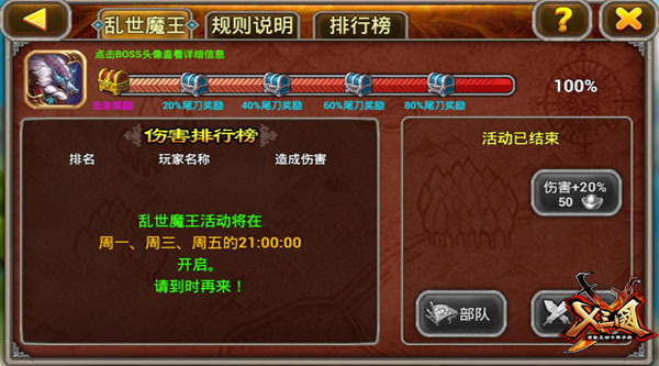 张牙舞爪的魔王乱入三国,华丽丽的世界BOSS大战火爆开启,引来全服沸腾!从此以后,主公们不但可以每周二、四、六晚上9点30分一起鏖战公会战,还可以在每周一、三、五晚上9点进入“乱世魔王”界面,一起打怪兽!《X三国》的日常也太丰富了吧!