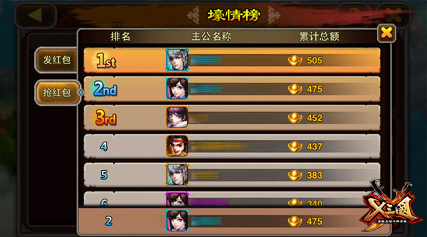 本世纪最流行的社交方式“抢红包”霸气登录《X三国》了!有钱任性的土豪们可以把元宝分给游戏内的所有小伙伴,加深彼此的感情羁绊,培养战斗友情,也妥妥的拉动《X三国》内的GDP哦!啧啧,今天你收到多少红包了呢?