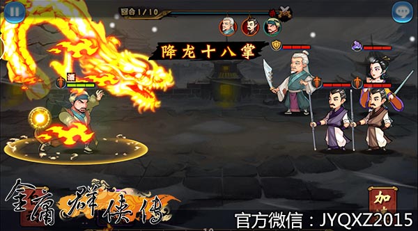 降龙十八掌,丐帮镇帮绝学,至刚至强至阳,是外门武学中登峰造极的招式。在《金庸群侠传》中,降龙十八掌作为乔峰乔帮主的重要绝招,招如其人,都有着光明磊落日月同辉的鲜明特色。降龙十八掌技能放出后,可以对全屏敌人造成伤害,对灼烧状态的敌人还具有伤害增加效果。强大的全屏伤害固然是威力惊人,然而也不可避免不能精准打击的缺憾。而且需要灼烧技能配合,在现有的缘分组合中恐怕很难找到,所以该招式的组合效果不够理想,不能最大程度发挥其毁天灭地的大威力。