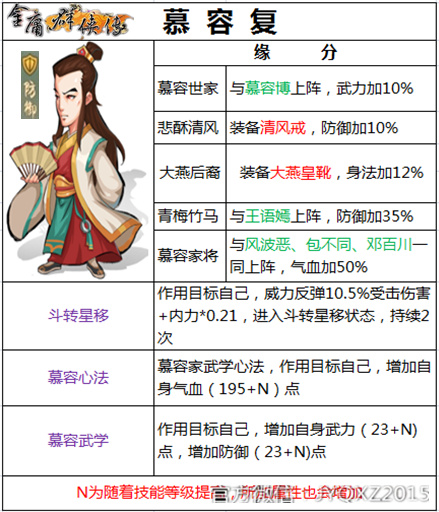慕容复,虽然在小说中志大才疏目中无人,最后落得失意癫狂,是个不为人所喜的角色。但是在《金庸群侠传》中,慕容复无疑是最热门的英雄之一,其中最重要的一个原因就是其实用性超强的“斗转星移”技能。斗转星移技能可以必然闪避攻击,等于让角色拥有“无敌”效果2次,而怒气消耗只需70,可谓是技能中的性价比之王。更恐怖的是反弹伤害,自身内力值越高,反弹的伤害就越大,颇有不战而屈人之兵的威势。故从实用性上来讲,在绝对防御的同时还能对对方造成伤害,斗转星移当之无愧实用神技排行第一位!