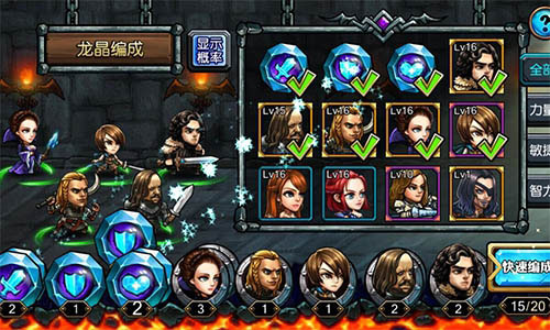 龙晶玩法,也可以说成是天拓游戏《冰火幻想》中的技能玩法,这也是游戏创新的地方。一枚龙晶代表一个技能,你在战斗中能释放出多少个技能,就看你携带了多少枚龙晶。你在战斗中能释放出哪些技能,就看你有没有携带对应的龙晶上战场。比如说你某场战斗前携带了10枚龙晶,其中5枚是龙母的,5枚是雪诺的,那么你战斗中一共就能释放10次技能,且只有龙母和雪诺可以释放技能,就算你的阵容里还有詹姆猎狗,没有对应的龙晶他们就只能普通攻击。这样通过将所有技能转变成龙晶的方式,虽说场上需要操控的东西还是很多,但是操作量却是大大减少。