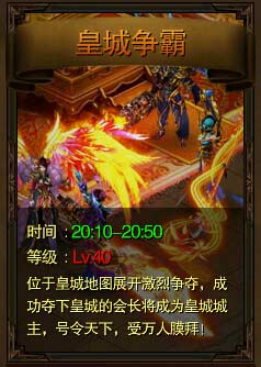 40级以上的已申请皇城争霸的公会玩家们,可于每日20:30-21:10在皇城内部展开攻守对战!铠甲未碎,神力相接,征战之声回响不绝,群雄逐鹿等你来战!