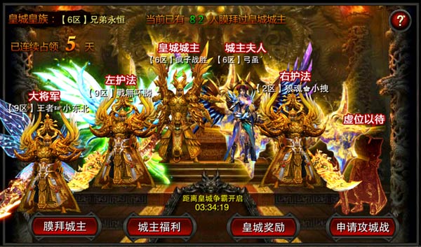 攻下皇城或守住皇城的公会会长即可获得霸气称号——“皇城城主”!号令天下,指点疆场,受礼参拜,固守皇城!除此之外,每次争霸活动后,获胜公会又可获得海量金币与大量元宝作为得胜嘉奖!