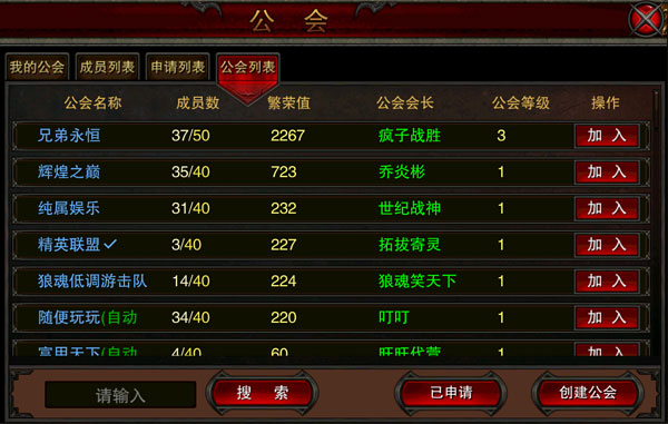 若要参与皇城争霸,就需要拥有一群并肩作战的热血真兄弟,并开创属于自己的公会。创建公会需要金钱及上古神物蚩尤之角,之后便可添加公会成员。公会成立后,每日可进行捐献,不仅捐献值可用于购买公会商店道具,捐献力度也会同步辅助公会繁荣度及等级的增长。公会升级即可获得额外成员名额,使公会日渐壮大,不断扩张,强可敌国!