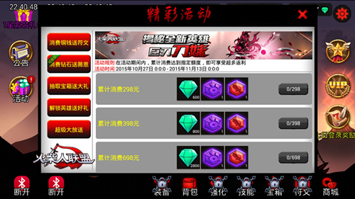 输出不止,福利不断,天天都是双十一!全新限时活动即将火爆登场,只有你想不到,没有你抢不到。钻石、钱币、装备……应有尽有;打怪升级,so easy啦。