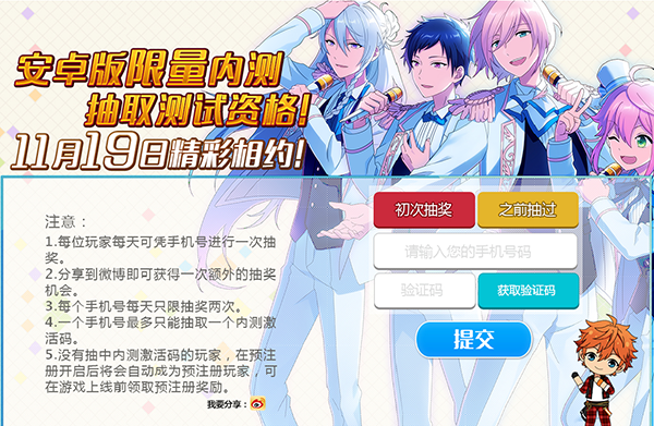 11月16日起每天都可以在《偶像梦幻祭》官网参与抽奖活动,有机会抽到激活码哦(毕竟自古转校生幸运E,又有光环加持)!每天可以抽一次,将抽奖页面转发到微博还可以多一次机会(咳咳,戳一戳可能有惊喜)!参与抽奖需要手机号码验证,参与抽奖的转校生们将自动成为预注册用户哦(一箭N雕有木有)!
