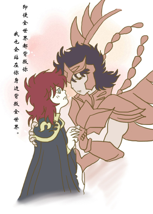 白羊座穆,处女座沙加,又是一堆经典的CP,犹记得,沙加在沙罗双树园的战斗,闻讯赶来的穆没有推开那扇紧闭的大门,而是忠实得守在门外。一句"沙加,我不会阻止你,更不会让其他人阻止你”,包含了多少深情在其中,叹息之墙前,两位好基友意外重逢,沙加默默不语,二人也只是深情对视,无需多言,一句“穆先生”足矣。