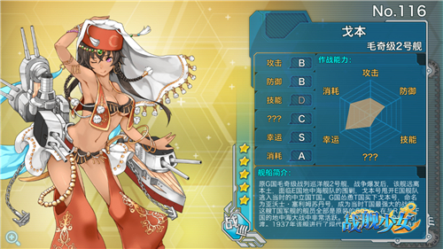 稀有的五星金皮战列巡洋舰,火力、耐久、装甲等各项属性都十分一般——但是这个西域风情的舞娘实在美得不行,翻遍了全图鉴,拥有小麦肤色的舰娘除了戈本外,只有两个美国牛仔“俄克拉荷马”和“布鲁克林”了……