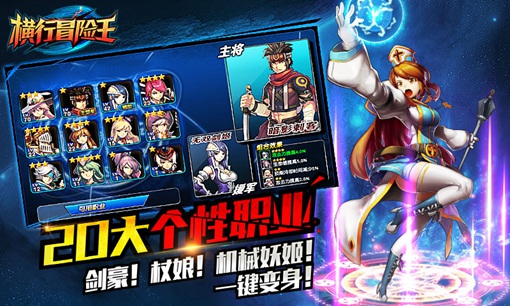 《横行冒险王》首创横版格斗手游20大职业体系,剑豪、狂刃、圣殿骑士、大元素师、机械妖姬……各职业特色鲜明,定位明确,分别代表20种不同的性格。肉坦、输出、辅助、治疗,堪比大型MMO的职业架构,让每个玩家都能找到适合自己的角色,体验到不同战斗模式带来的丰富快感。同时游戏内增加了一键切换功能,在主城内可以随时随地更换角色,职业装备共享,简化了替换装备的繁琐操作,真正实现玩家一键变身。更有雇佣兵、主副将等特色职业玩法,让救世主也可以当得充满乐趣。