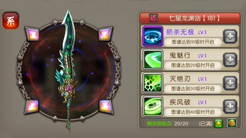 在实际的玩法中,七星龙渊作为《武器大师》短兵器家族中的稀有级典藏,素以技能招式的特效BUFF,以及爆炸性的终结输出见长,对远程弓箭克制具有奇效(20%的伤害加成)。自带的三项被动天赋:鬼魅行(双数回合额外伤害)、灭绝刃(吸血)、疾风破(概率加攻BUFF)注定七星龙渊“高攻高吸血”的输出流派走向。然而,当其六段终结(1000%本体输出)奥义释放的瞬间,才是千年剑道鼻祖的真正威力,也正因为如此,但凡有幸目睹七星耀世、匣光出鞘的对手都在华丽中飘落埋尘。