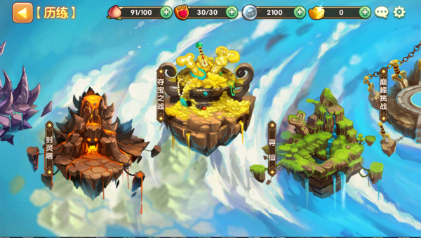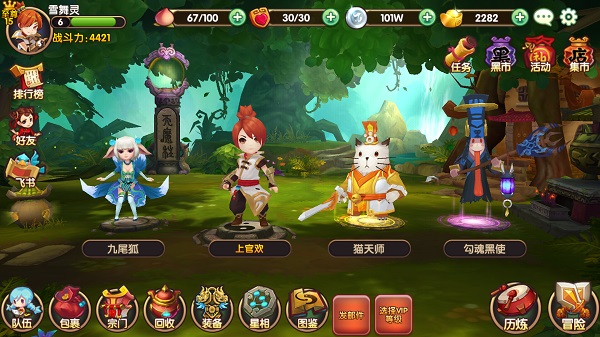 主界面?展示主角和当前上场的符灵(宠物),九尾狐妹妹Q萌妩媚造型一眼就把我秒杀,还有呆萌的猫天师简直就是恶意卖萌!而且点击人物都有趣味动作,卖萌耍酷样样有,简直妹纸汉子通杀!
