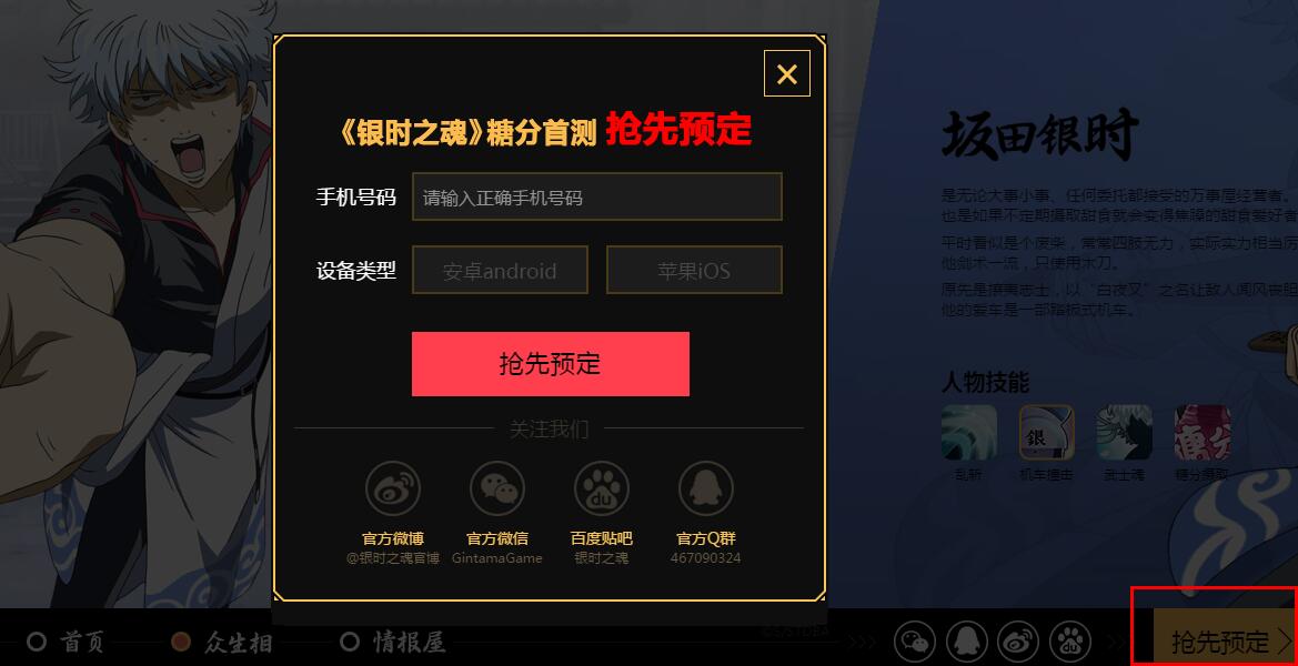 目前,官网也已同步开放了首测预定的通道,想要成为首批正版银魂手游的玩家现在就可以点击官网进行首测预定,但是官网并没有说明何时进行首测,我们也只能进一步等待消息。