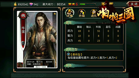 在《三国演义》中牛金初为曹仁部曲将,周瑜军数万人来攻,前锋数千人始至,曹仁登城望,乃募得三百人,遣牛金迎战。但对方兵力较多,牛金遂被围困。曹仁亲自杀入阵中救出牛金,大破吴军。之后,司马懿使牛金轻骑饵诱蜀军,刚交战诸葛亮就退兵,追至祁山。蜀将马岱入寇,司马懿遣将军牛金击退,斩千余级。公孙渊反,司马懿帅牛金、胡遵等步骑四万发自洛阳,后平定辽东。牛金官至后将军。在《啪啪三国》中,一星的牛金实在没有啥出彩的地方,但凭借其脸蛋还是赢得了不少玩家的关注。