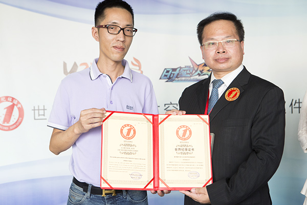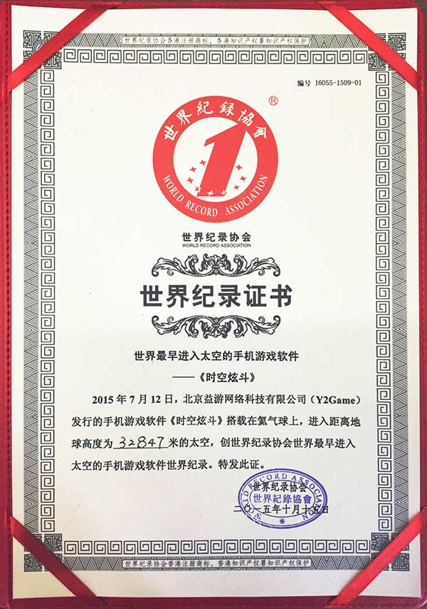 为了肯定《时空炫斗》此次创新的升空事件,世界纪录组织工作人员也专门来到了Y2Game公司,为此次游戏升空事件的掌舵者公司CEO庞益军先生颁发了世界纪录荣誉证书。