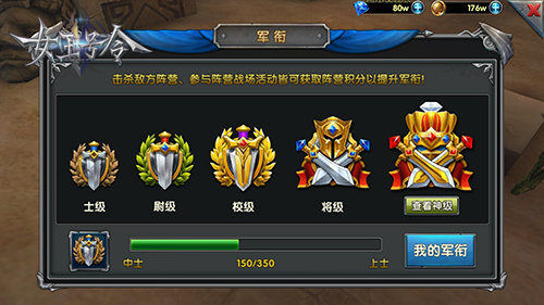 军衔系统,作为9377《女王号令》之中的一大系统玩法,将会见证勇士们在这神魔横行的中世纪时代的成长征程。军衔系统由低至高包括士级、尉级、校级、将级以及神级这五个段位,随着历练之旅的深入,每一名勇士都有可能成为神一般的存在!