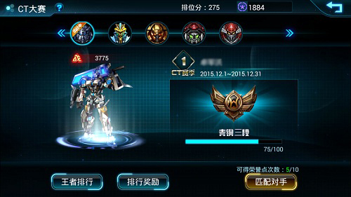 玩家每天前10次积分赛战斗可以获得CT币,使用CT币可以在CT商城内兑换商品。排位赛是以赛季形式进行的,赛季以每月的1号开始,每个月的最后一天结束。结束时会根据玩家当前的段位发放奖励,并且根据结算时的段位获得玩家下一赛季的初始段位,该段位直接配置。