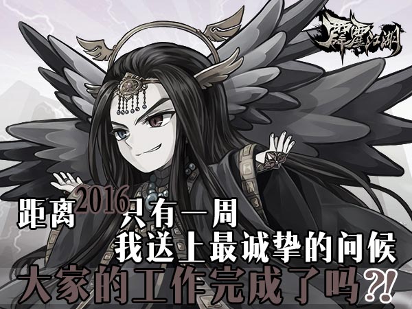 今日准备带着九祸度假的银锽朱武,突然变的闷闷不乐。当众人问其缘由,他拿出刚收到的一份邮件。老板弃天帝给大家带来的圣诞问候:“距离2016只有一周,老板送上最诚挚的问候,大家的工作完成了吗?”据说,银锽朱武取消了休假计划,回公司做了一个 “砸元宝”的活动。至于他原来想砸的是谁,猜猜看呀?