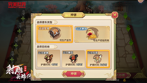首先来介绍下押运的镖种类,《射雕英雄传3D》手游镖行九州玩法中的镖车类型有两种,分别是运送军饷与运送粮草,区别在于运镖结束后所获得的奖励,金币与经验,各位侠士可因时制宜,根据所需奖励选择镖车类型。