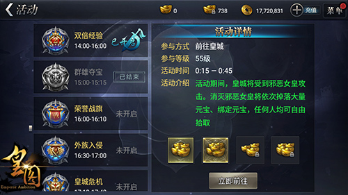 而这七大狂欢活动之中的“丰厚攻城福利”玩法,将会为夺下皇城的勇士强者带来更加丰厚的攻城礼包,奖励高达1500元宝。都说重赏之下,必有勇夫。各位皇城的勇士,何不藉此机会在9377《皇图》的“攻城战”之中一举夺下皇权,树立自己的威名!