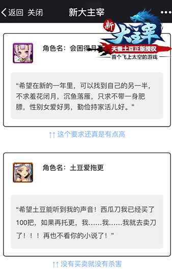 从后台的记录来看,许多铁杆土豆粉为《新大主宰》原作小说作者,爱拖更的天蚕土豆送上了“衷心的祝福”,要给他送上刀片蜡烛小皮鞭等贴心大礼。在单身狗普遍求带走,秀恩爱被咒死得快的大环境下,一句“全世界都充满了恋爱的酸臭味,只有我散发出单身狗的清香”显得那样超凡脱俗。还有才艺达人吹口哨娇喘若干,优秀的表演达到了听到的人都想去厕所的地步。能得蛇精病玩家如此,后台工作人员的内心一定是崩溃的!