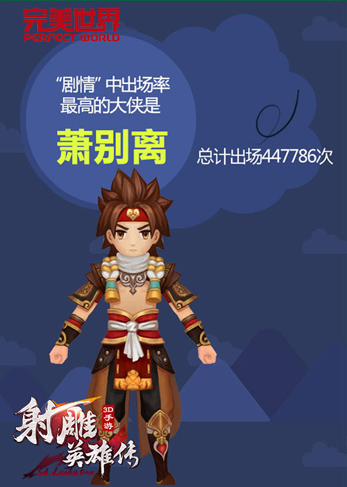 萧别离,英俊的面庞,蓬松的发型,虽着一身妖娆的露胸露背装,但这却丝毫掩盖不了萧大侠的一身正气……咳咳,萧别离,《射雕英雄传3D》手游的男主角,相信各位射友对他再熟悉不过了,毕竟人家是初始角色嘛~在安卓首测中,总计出场447786次,平均每秒钟都有萧大侠的身影出现,从第一集一直演到最后一集,这种勤勤恳恳的敬业精神,年度最佳真·主角,妥妥的~