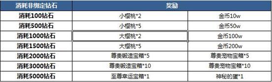 在活动期间,玩家消耗不绑定的钻石达到指定的额度,就能获得大量奖励。不同的额度能领取不同档次的奖励。