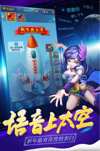 在《新大主宰》火爆公测的同时,“太空表白”活动也在如火如荼进行,不知道怎么让你的表白从一众追求者中脱颖而出?“太空表白”计划来帮你。活动期间在《新大主宰》游戏中,玩家可以通过“语音火箭”入口可录制一段30s的语音信息,许愿表白发祝福,你想传达的都可以在这里准备好。这些表白将随着“新大主宰号”火箭飞往太空,2016年最高的表白,想必非“太空表白”莫属吧!