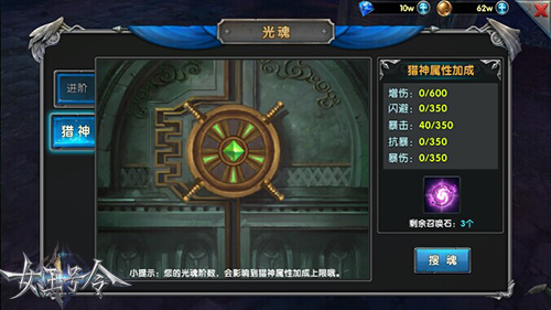 在9377《女王号令》之中,勇士强者们通过猎神玩法能够获得的属性加成包括增伤、闪避、暴击、抗暴以及暴伤这五大类。而猎神属性的加成会拥有一个上限,要想突破猎神属性加成上限,勇士强者们就必须通过注魂来讲自身的光魂提升至更高的等阶。