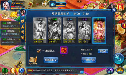 漫漫修仙路,寂寞总是在不经意间到来,此时若是放下种种琐事,与美人同游一番,说不定能领悟修仙的真谛,更进一个阶级。在《天天爱仙侠》中,无论你在何时何地,只要你想要与美人出门一游时,都可以参与携美同游活动。画仙处共有白獐、绿野、蓝燕、紫薇、灵儿五位美女可选择同游,不同的美女自然奖励不同,其中灵儿的奖励最为丰厚。如果对当前同行的美女不满意的话,可以使用仙女飘带进行刷新。